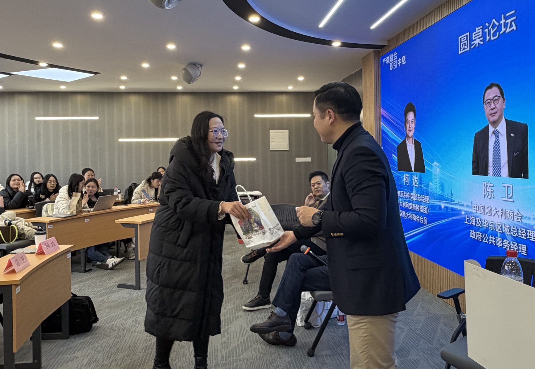 随后,三位嘉宾围绕外企人才需求与职业发展路径展开深度分享。柯达凭借多年外企高管经验,指出外企必须深入融合本地文化、人才与市场才能持续发展。他建议同学们在校期间加强语言能力,除英语外可适当学习意大利语、德语等工业强国语言,同时培养跨文化沟通与实际问题解决能力,为未来进入外企做好准备。徐皓以所在意大利家族企业为例,分享了企业在华战略与人才观。他表示,意大利企业重视员工的价值贡献与文化认同,招聘时不仅关注英语能力与专业背景,更青睐自信主动、具备解决问题意识和可塑性的人才。陈卫从意大利商会视角,分析了在华意企的人才需求与产教融合方向。他介绍,意大利在华企业覆盖机械制造、医疗器械、奢侈品、物流等多个行业,超八成属于家族企业。这类企业重视员工与企业文化的匹配度,并为认同其价值观的员工提供长期发展通道。
