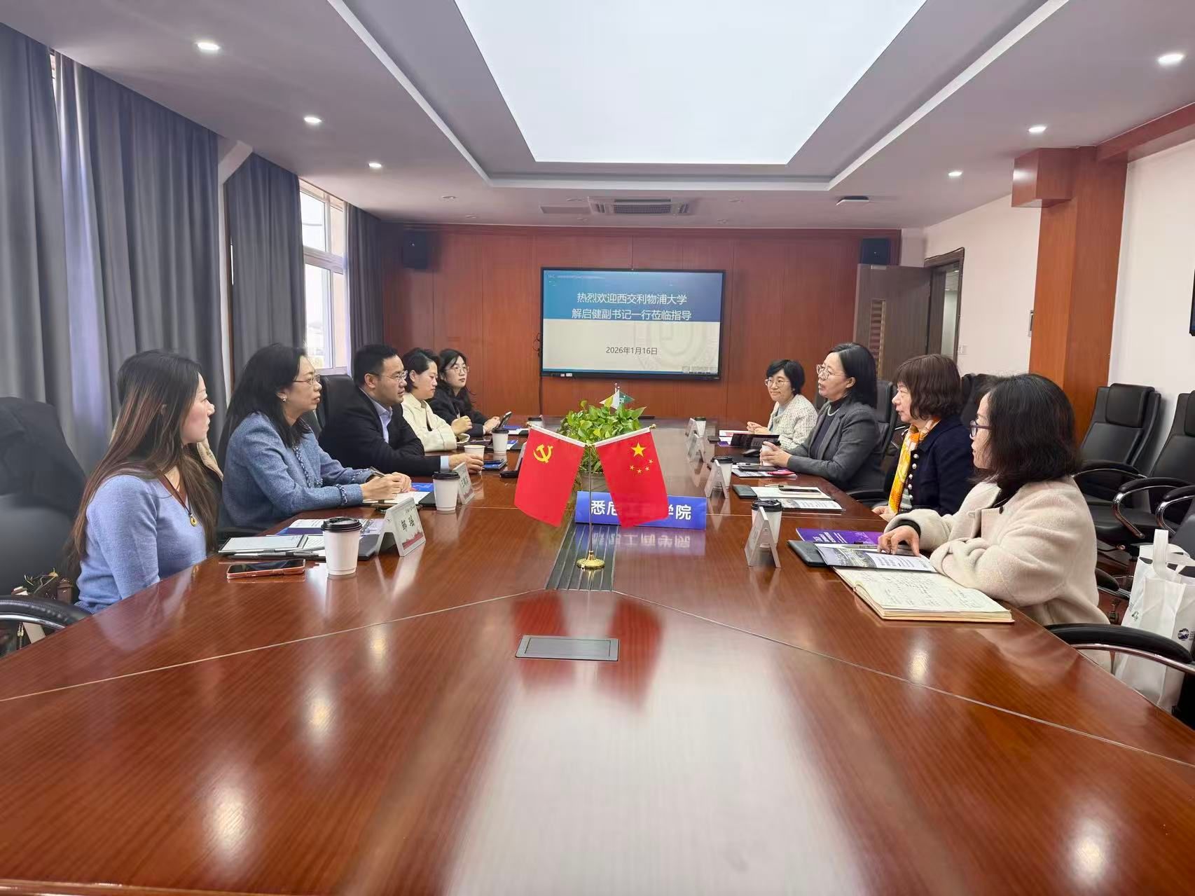 1月16日上午,西交利物浦大学党委副书记解启健、国际商学院常务副院长王鹤菲等一行五人来悉尼工商学院调研访问。会议在文荟楼409会议室举行,学院党委书记吕康娟,副书记、副院长卫静芬等出席调研会议。