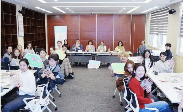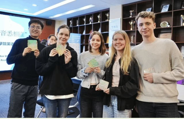 卫静芬、旷群、顾浩东共同上台,宣布2025-2026学年上海大学悉尼工商学院英语文荟节正式启动。 清韵寄怀,心通四海。启动仪式后,现场开展了“竹韵绕指,情连中外”中外师生竹编文化体验活动。中外师生首先自主选择喜爱的杯垫图案,随后分组就坐,之后在学生会素质拓展部同学的细致讲解与指导下,动手编织,通过穿篾、交织的手工实践,沉浸式感受中国传统竹编技艺的精巧与匠心,在协作互动中传递跨文化情谊,近距离体验中华非遗文化的独特魅力。活动最后,全体领导、嘉宾与师生代表共同合影,举起手中的竹编杯垫,定格下了这一美好时刻,正式拉开了本届英语文荟节的华彩序幕。
