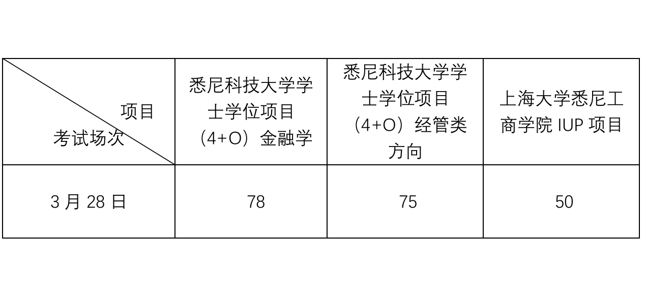 根据《2026年悉尼科技大学学士学位项目和上海大学悉尼工商学院IUP项目招生录取办法》,经学院研究决定,现将悉尼科技大学学士学位项目和上海大学悉尼工商学院IUP项目2026年3月28日入学考试录取分数线公布如下: 一、成绩查询 已参加4月11日面试的考生可于2026年4月15日13:30起登录悉尼科技大学学士学位项目和上海大学悉尼工商学院IUP项目招生报名系统 (https://silcadmission.shu.edu.cn/),查询2026年3月28日入学考试的成绩和录取结果。 二、录取分数线